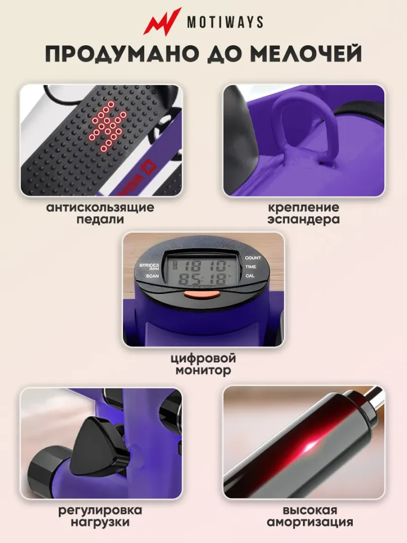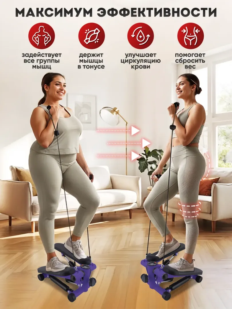 Начните свой путь к здоровью и отличной физической форме уже сегодня с нашим мини-степпером! Независимо от погоды и времени суток, вы всегда сможете провести эффективную тренировку у себя дома. Закажите тренажер для похудения с эспандерами прямо сейчас и сделайте первый шаг к своему идеальному телу!